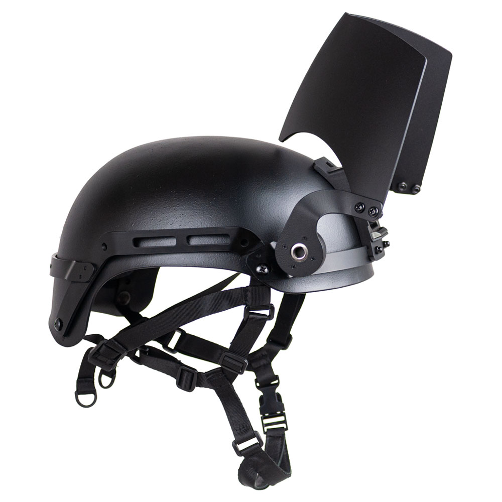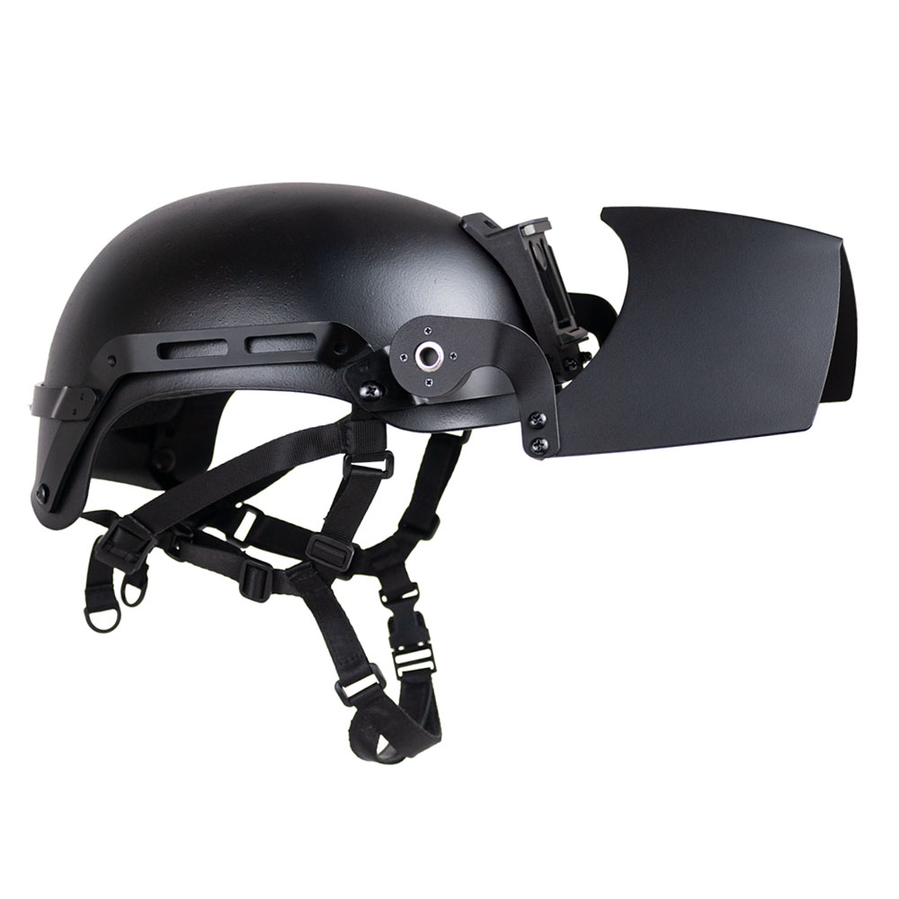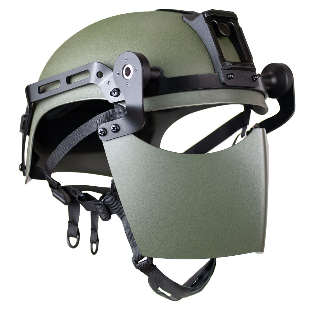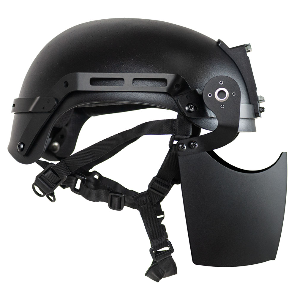 Add‑on armor designed to upgrade the area of coverage of the NovaSteel ballistic helmet so that it can offer facial protection from high‑velocity fragment, blunt impact, and pistol‑caliber threats. The updated model includes a durable sealed hinge that allows silent, tool‑free positioning from down to fully up.